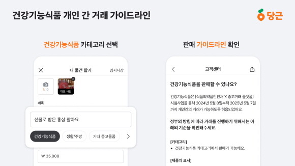 건강기능식품의 개인 간 거래 허용에 대한 소비자 목소리가 꾸준히 있어옴에 따라 작년부터 규제 심판부 예비 회의와 시민 공개 토론이 진행됐고, 내일 오전 10시부터 시범 사업이 진행된다. 당근은 시범 사업 플랫폼으로 선정되어 개인 간 건강기능식품 거래가 가능하도록 제반 사항 점검 및 시스템 구축을 마쳤다.