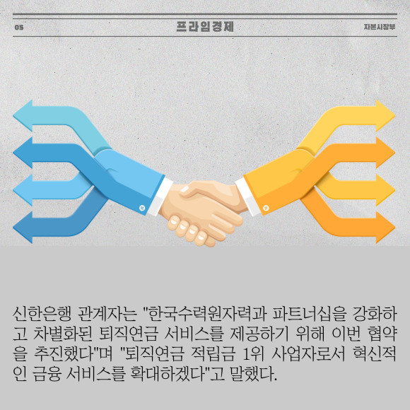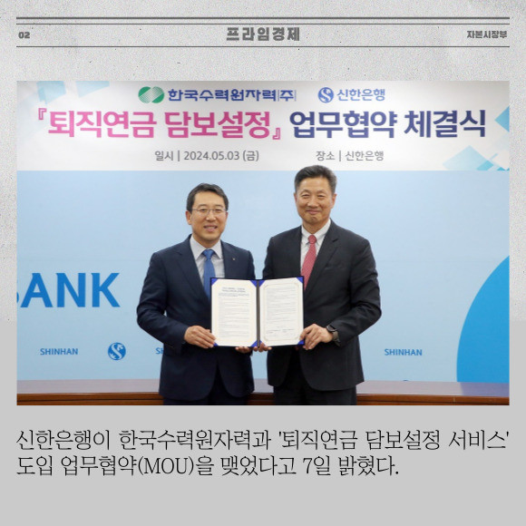 [프라임경제] 신한은행이 한국수력원자력과 '퇴직연금 담보설정 서비스' 도입 업무협약(MOU)을 맺었다고 7일 밝혔다.