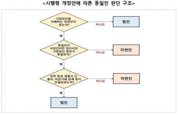 다만 △동일인을 자연인으로 보든 법인으로 보든 기업집단의 범위가 동일하고 △기업집단을 사실상 지배하는 자연인이 최상단 회사를 제외한 국내 계열회사에 출자하지 않으며 △해당 자연인의 친족이 국내 계열회사에 출자하거나 임원으로 재직하는 등 경영에 참여하지 않고 △자연인 및 친족과 국내 계열사 간 채무 보증이나 자금 대차가 없는 경우에는 법인을 동일인으로 정할 수 있도록 했다.