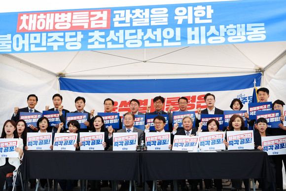 이어 "사망 사고 이틀 뒤 국가안보실이 해병대 수사단에 요구해 수사계획서를 받았다는 것이 드러났다"며 "(윤 대통령이) 특검을 거부하는 것은 곧 자신에 대한 거부권이라 헌법적 남용"이라고 강조했다.