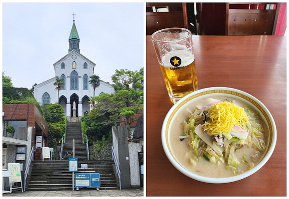 2일차 오전에 나가사키에 도착, 약 10시간의 일본 자유 관광 시간이 주어졌다. 오우라 천주당(왼쪽)과 나가사키 짬뽕 원조의 맛을 맛볼 수 있는 '시카이로'. = 추민선 기자
