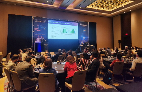대웅제약은 19일 오후 워싱턴 D.C. 메리어트 호텔에서 '펙수클루의 밤' 심포지엄도 성공적으로 개최했다. 이날 펙수클루의 밤에는 브라질, 콜롬비아, 멕시코, 한국 등 8개국 의사 100명이 참석했으며, 정훈용 아산병원 교수와 맥스 슈멜슨(Max Schmulson) 멕시코 국립자치대학(UNAM) 교수가 좌장으로 나섰다. 심포지엄에서는 다양한 임상시험을 통해 입증된 펙수클루의 효능, PPI 계열 대비 뛰어난 P-CAB 계열 치료제의 효과 등에 대한 강의 및 케이스 스터디 발표가 진행됐다.