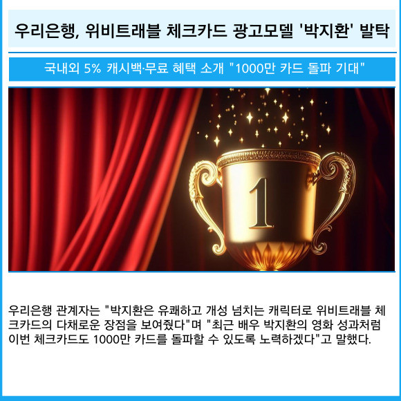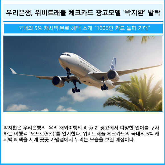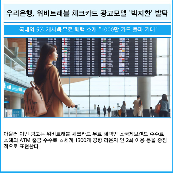 [프라임경제] 우리은행이 지난 10일 출시한 '위비트래블 체크카드'의 광고 모델로 배우 박지환을 발탁했다고 14일 밝혔다.