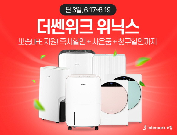 먼저, 오늘부터 사흘간 '더쎈위크 위닉스 기획전'을 개최하고 △제습기, △건조기, △창문형에어컨, △제습기 △공기청정기 △서큘레이터 등 위닉스의 대표 여름가전 100여 종을 특가 판매한다. 특히, 위닉스의 대표 상품인 △17L 용량 제습기(DN3H170-LWK), △16L 용량 뽀송 제습기(DN2H160-IWK) 등을 저렴하게 마련할 수 있는 기회다.