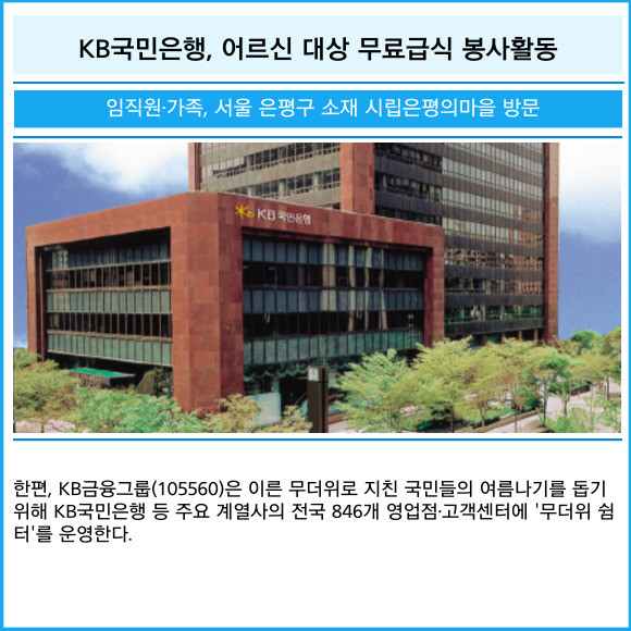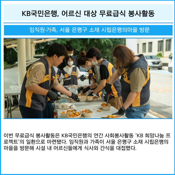 [프라임경제] KB국민은행이 지난 15일 어르신 대상 무료급식 봉사활동을 진행했다고 18일 밝혔다.