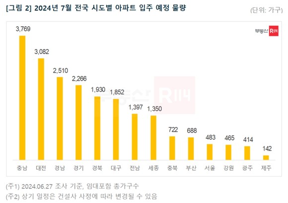 한편 지방 아파트 입주 예정 물량(1만8321가구)은 △충남 3769가구 △대전 3082가구 △경남 2510가구 △경북 1930가구 등이다.