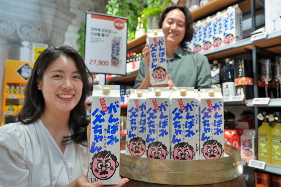 롯데마트와 슈퍼는 국내 인기 사케(일본 청주)인 '간바레 오또상'을 대용량으로 기획, 지난달 27일부터 오프라인 채널 단독으로 출시해 판매한다. © 롯데마트