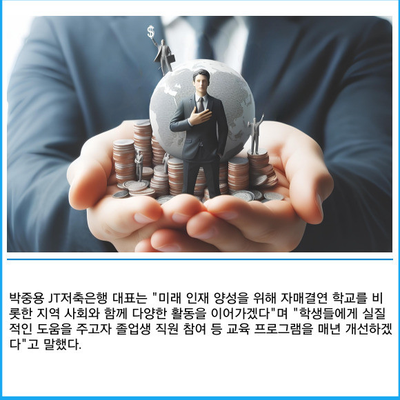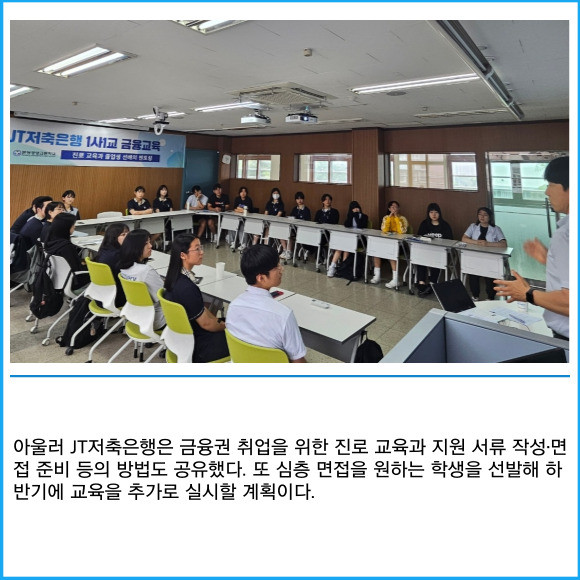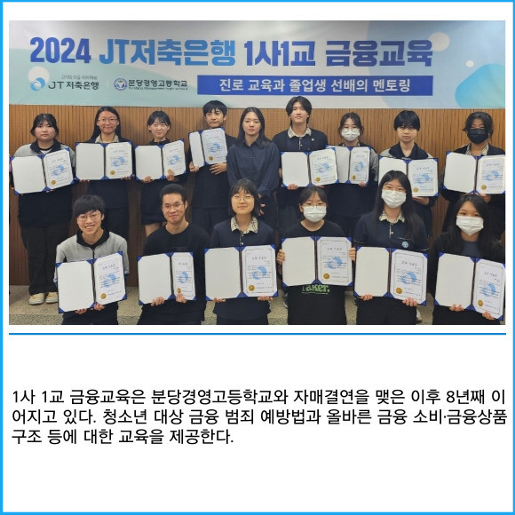 [프라임경제] JT저축은행이 지난 16일부터 17일까지 분당경영고등학교 재학생을 대상으로 1사 1교 금융교육을 진행했다고 18일 밝혔다.