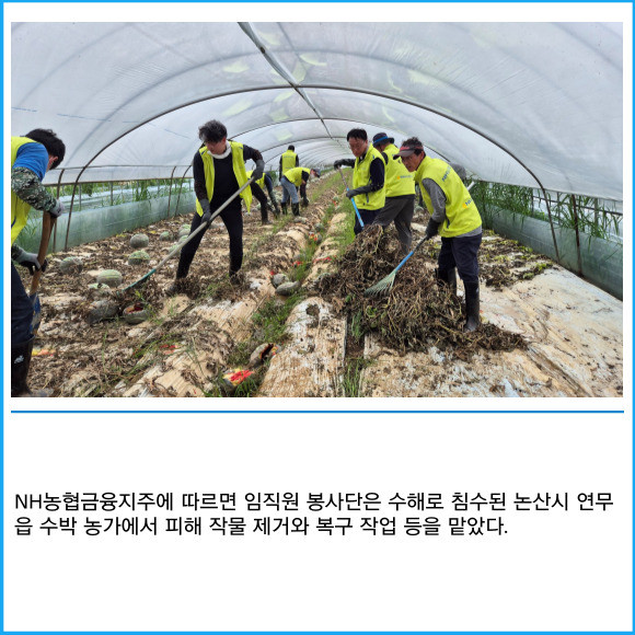 [프라임경제] NH농협금융지주가 지난 17일 충남 논산시 연무읍 일대 집중호우 피해 농가를 찾아 일손 돕기에 나섰다고 18일 밝혔다.