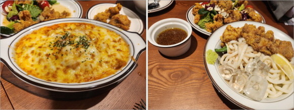 노랑통닭 강남구청 직영점에서 판매 중인 점심메뉴. 떡볶이 그라탕(왼쪽), 시원한 치킨 냉우동. = 추민선 기자