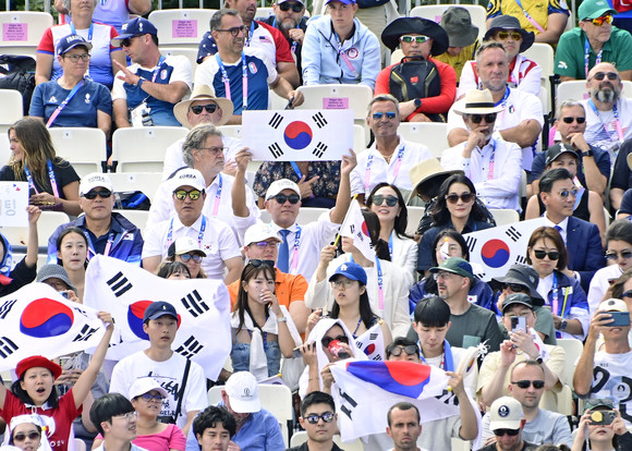 정의선 회장이 28일(현지시간) 파리 대회 양궁 여자 단체전 경기를 찾아 김재열 IOC 위원, 이서현 삼성물산 전략기획담당 사장과 관람석에서 응원하고 있는 모습. ⓒ 현대자동차그룹