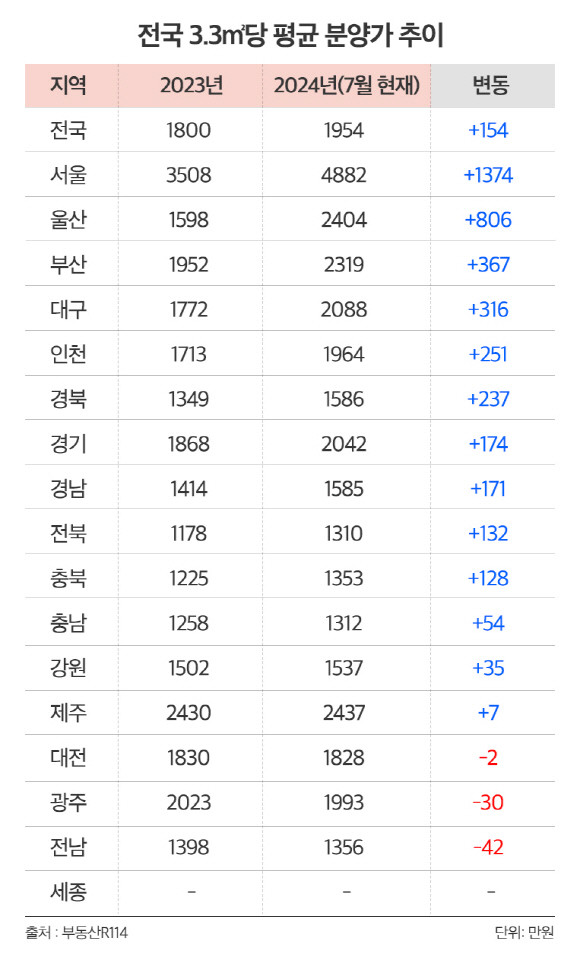 반면 지방도시들은 비교적 낮은 분양가를 보였다. 전북 1310만원을 비롯해 △충남 1312만원 △충북 1353만원 △전남 1356만원 등 충청·전라도 분양가가 1400만원 미만에 그쳤다.