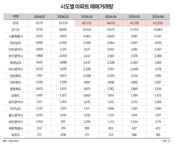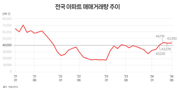 부동산R114 자료에 따르면 지난 6월 전국에서 4만3300건 상당 아파트 매매 거래가 이뤄졌다. 3월(4만233건) 10개월 만에 4만건을 회복한 이후 △4월 4만4119건 △5월 4만3278건에 이어 4개월째 연속 매매량을 유지하고 있는 것이다.