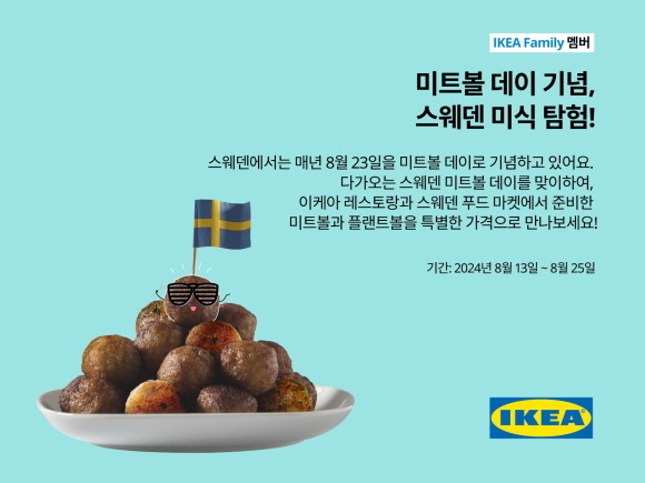 이케아 코리아는 8월23일 '스웨덴 미트볼 데이'를 맞아 더 많은 사람들이 스웨덴 대표 음식 미트볼과 함께 스웨덴 문화를 경험하고 맛있는 쇼핑을 즐길 수 있도록 이번 행사를 준비했다. 행사 기간 이케아의 무료 멤버십 프로그램 '이케아 패밀리' 멤버라면 이케아 전 매장(광명점, 고양점, 기흥점, 동부산점)에서 미트볼, 플랜트볼 할인 혜택을 누릴 수 있다.