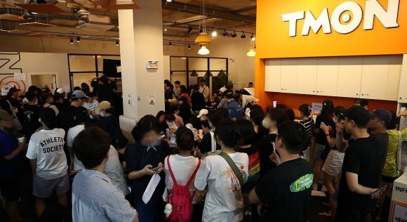 지난달 26일 티몬·위메프 피해자들이 서울 강남구 티몬 신사옥에서 환불을 받기 위해 대기하고 있다. © 연합뉴스