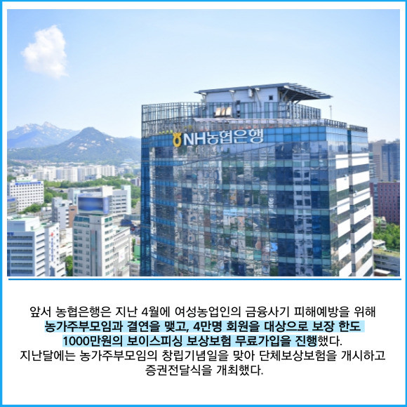[프라임경제] NH농협은행은 지난 23일 농협 안성교육원에서 농가주부모임전국연합회 회원을 대상으로 보이스피싱 보상보험 무료가입을 하고 증권전달식을 했다고 26일 밝혔다.