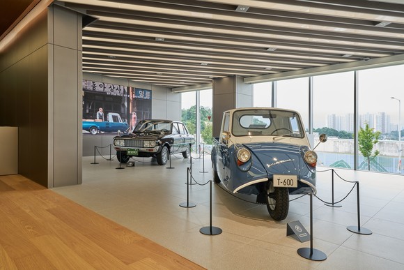 '기아 헤리티지 특별 전시'를 위해 내부에 전시된 T-600과 브리사 복원 차량. ⓒ 기아