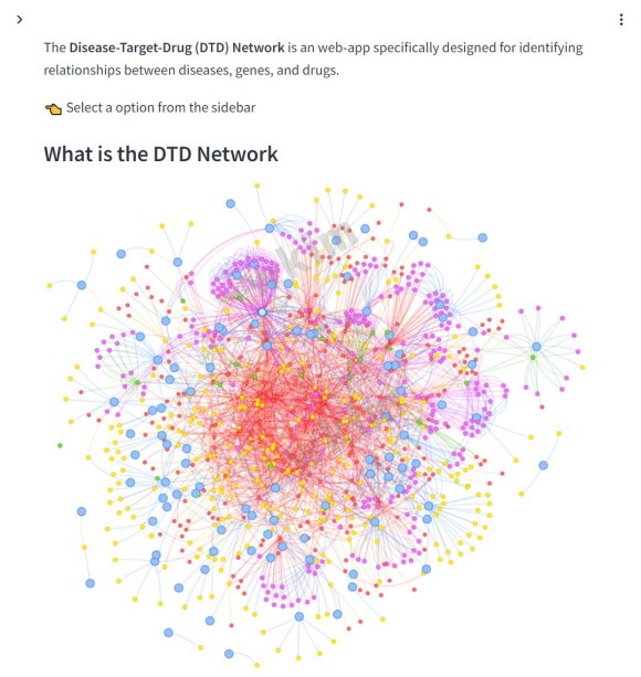 제이웨이브 플랫폼의 AI 모델 중 하나인 Disease-Target-Drug(DTD) 네트워크가 질병, 유전자, 약물 간의 복잡한 상호작용을 시각적으로 보여주고 있다. 해당 네트워크는 신규 타깃 단백질 발굴과 기존 약물의 새로운 적응증 탐색에 활용된다. © JW중외제약