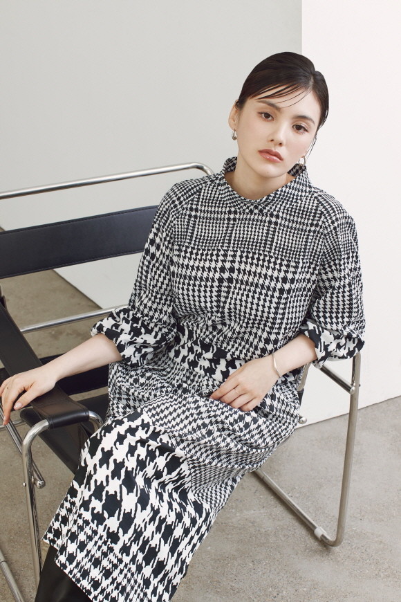 블랙-화이트 하운드투스 패턴 팬츠와 긴팔 블라우스는 부분적으로 서로 다른 크기의 체크 무늬를 접목해 단조로워 보이지 않으며, 클래식한 FW룩을 완성하기에 제격이다.