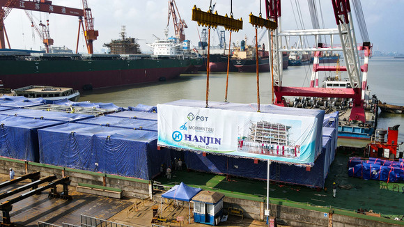 2차전지용 리튬염 제조 설비 모듈이 중국 난퉁시에 위치한 모리마츠 조선소에서 선박에 선적되고 있다. ⓒ 한진