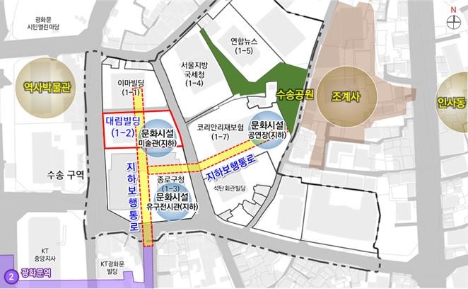 특히 광화문역에서부터 종로구청을 거쳐 대상지와 1-7지구(코리안리 빌딩)와 연계되는 지하공공보행통로를 설치해 도심 내 입체적 보행체계를 구축한다는 방침이다. 지하층에 문화시설(전시장)을 마련해 수송구역 인접 지구에서 추진되고 있는 문화시설과 연계하는 복합문화공간을 만들 계획이다.