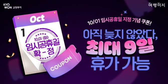 교원투어 여행이지가 국군의 날 임시공휴일 지정을 기념해 10월 황금연휴 할인 쿠폰을 배포한다.