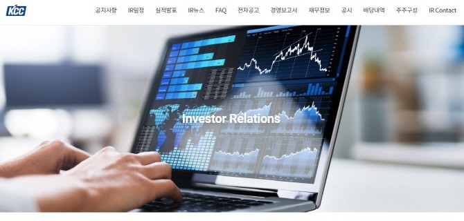 KCC는 지난해 주주 소통 강화 목적으로 IR 전담조직을 구성, 자사 홈페이지 내 IR 섹션을 구축한 바 있다. IR섹션을 통해 △온라인 배당 조회 시스템 △주요 QnA △경영보고서 △실적 등 주주가 원하는 정보를 제공하며 소통을 강화하고 있다.