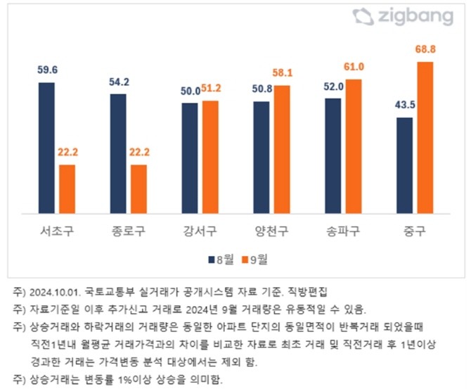 9월 서울 자치구별로 살펴보면 △중구 △송파구 △양천구 △강서구 4개 자치구를 제외한 21개 자치구에서 상승거래 비중이 줄었다.