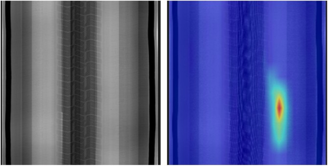 X-Ray 검사 장비로 결함을 확인한 타이어(좌)와 육안으로 확인이 거의 불가능한 결함까지 찾아내는 AI의 검사 결과 이미지. ⓒ 넥센타이어