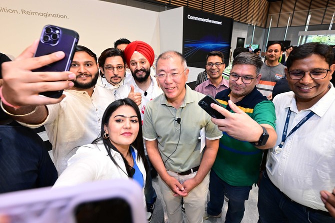 정의선 현대차그룹 회장이 지난 4월 현대차 인도권역본부 델리 신사옥에서 열린 타운홀미팅이 끝난 후 인도권역 현지 직원들의 셀피 요청을 받고 촬영하고 있다. ⓒ 현대자동차그룹