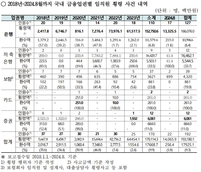 2018년~2024년 8월 국내 금융업권별 임직원 횡령 사건 내역. ⓒ 강민국 의원실