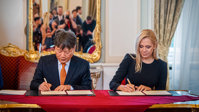 신공장 구축 투자 협약식에서 이규석 현대모비스 사장(왼쪽)과 데니사 사코바(Denisa Sakova) 슬로바키아 경제부 장관이 협약서에 서명하고 있다. ⓒ 현대모비스