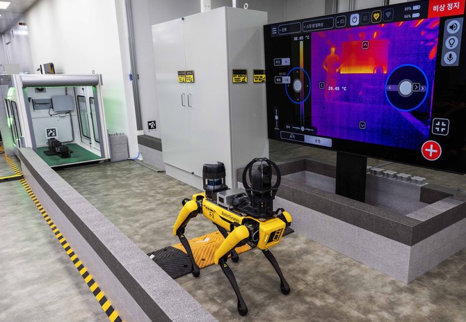 보스턴 다이나믹스의 4족 보행 로봇 스팟이 공장의 설비 상태를 점검하는 모습. ⓒ 현대자동차