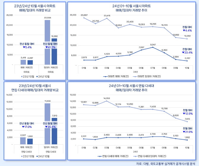 [프라임경제] 서울 지역 주택 거래가 대출 규제 등 여파로 감소하는 가운데, 올해 10월 모든 주택 유형에서 매매와 임대차 거래 모두 하락세를 보인 것으로 나타났다.