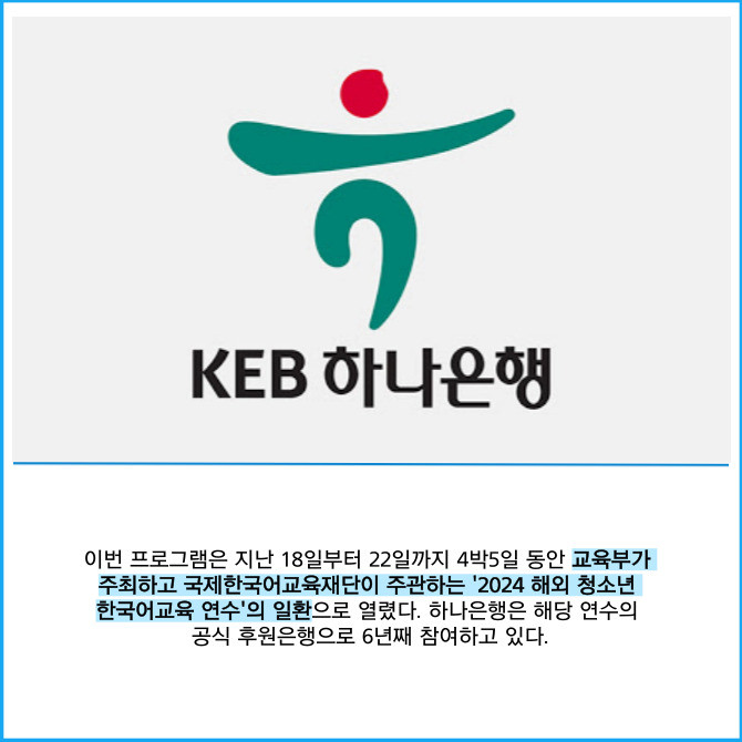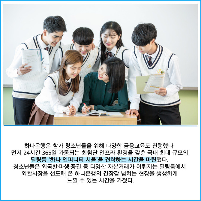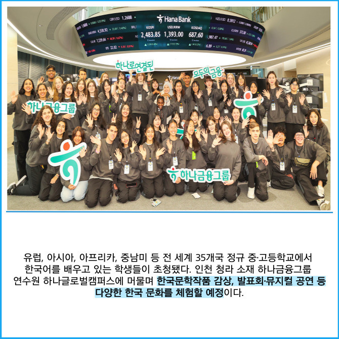 [프라임경제] 하나은행은 전 세계 35개국 청소년 100여명을 초청해 '글로벌 금융 체험 프로그램'을 진행했다고 21일 밝혔다.