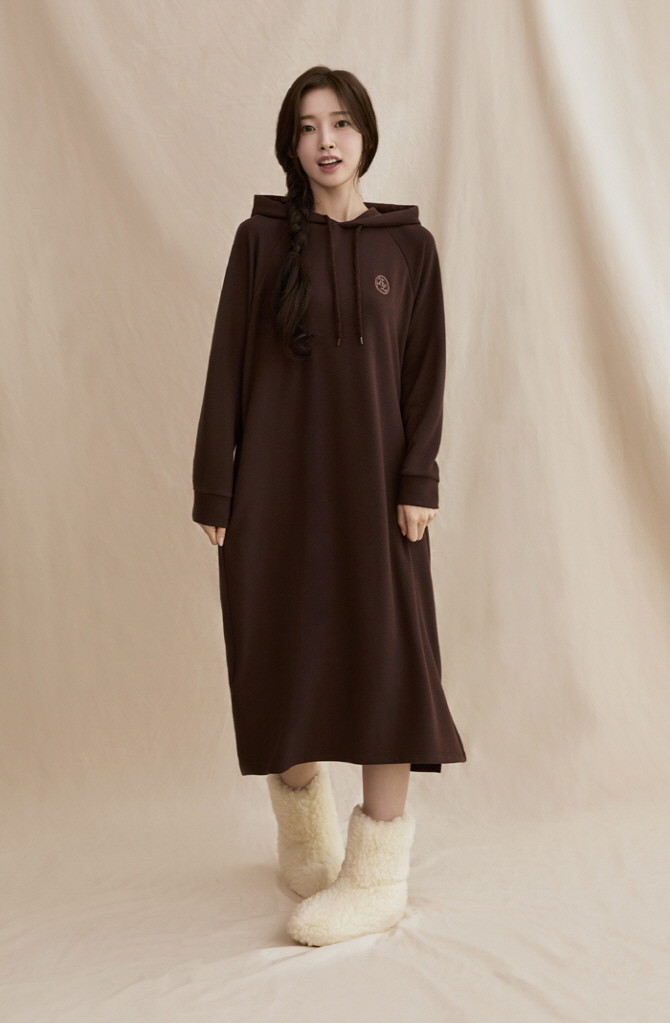 보디히트 니트후드원피스는 후드를 적용한 원피스 제품으로 잠옷, 홈웨어는 물론 아웃웨어로도 활용이 가능한 멀티웨어다.
