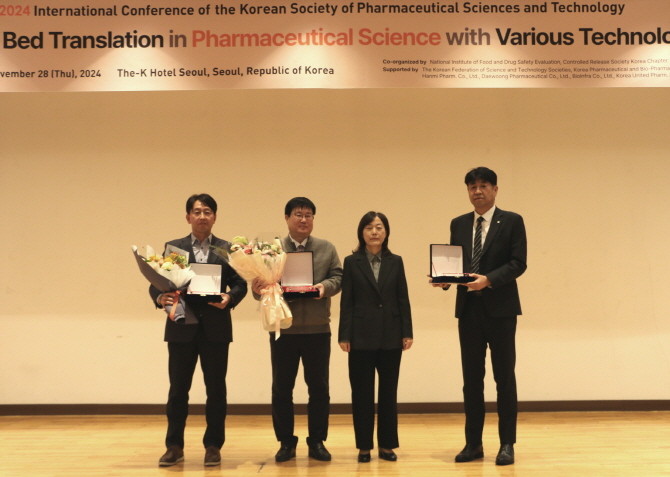 신신제약 이우영 부사장, 2024년 한국약제학회 생산기술공로상 수상. (왼쪽부터) 방준재 한국유나이티드제약 팀장, 이우영 신신제약 부사장, 한효경 한국약제학회장, 김철회 한국오츠카제약 상무이사 공장장. © 신신제약