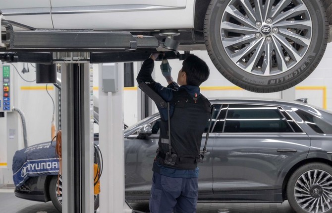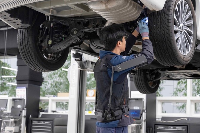 현대차 고양하이테크센터에서 작업자가 '엑스블 숄더'를 착용하고 차량 하부를 정비하는 모습. ⓒ 현대자동차