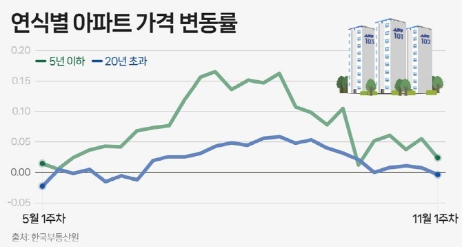 한국부동산원에 따르면 전국 기준 5년 이하 신축 아파트는 5월 2주차 이후 상승세로 돌아서 11월까지 매주 오름세를 유지하고 있다.  반면 20년 초과 단지는 신축보다 상승 전환이 2개월 늦은 7월 1주차부터 오르기 시작했다. 특히 하반기 들어 주간 상승률 기준 5년 이하 신축이 20년 초과 구축을 6배 이상 오르는 등 가격 상승세를 리딩하고 있다.
