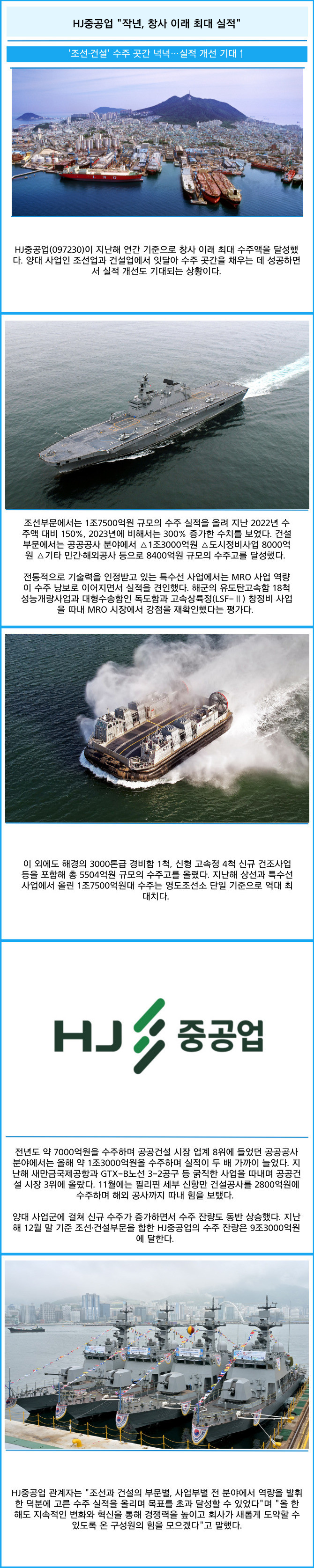 [프라임경제] HJ중공업(097230)이 지난해 연간 기준으로 창사 이래 최대 수주액을 달성했다. 양대 사업인 조선업과 건설업에서 잇달아 수주 곳간을 채우는 데 성공하면서 실적 개선도 기대되는 상황이다.