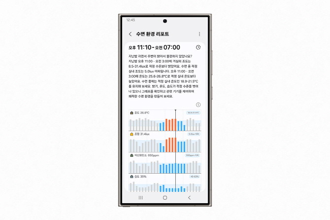 상반기 내 업데이트 예정인 '수면 환경 보고서(Sleep environment report)' 기능의 경우 삼성 헬스 앱과 스마트싱스(SmartThing) 앱을 연계해 구현하는 기능이다. 스마트싱스 앱에 연결된 기기들을 통해 수집된 데이터로 △실내 온도 △습도 △공기 질 △빛의 세기 등 수면 환경을 분석한 후 사용자에게 개인화된 최적 환경을 추천한다.