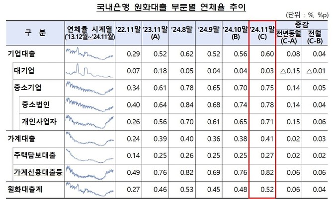 부문별로 살펴보면 대기업대출을 제외한 대부분 대출에서 연체율이 증가했다. 11월 말 기업대출 연체율은 0.60%로 전월 말 0.56% 대비 0.04%p 상승했다.