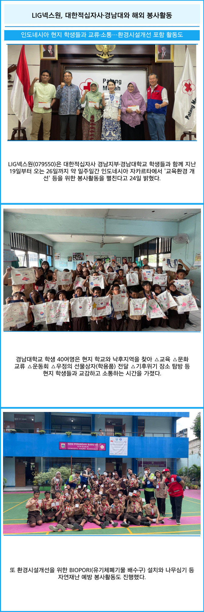 [프라임경제] LIG넥스원(079550)은 대한적십자사 경남지부·경남대학교 학생들과 함께 지난 19일부터 오는 26일까지 약 일주일간 인도네시아 자카르타에서 '교육환경 개선' 등을 위한 봉사활동을 펼친다고 24일 밝혔다.