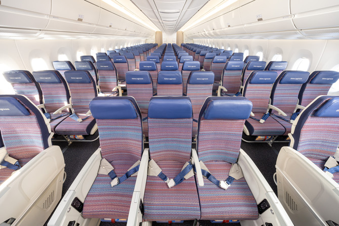 이코노미 클래스 좌석은 3-3-3 배열로 슬림시트를 장착해 넓은 좌석간격을 제공한 것이 특징이다. 또 슬라이딩 좌석 쿠션과 인체공학적으로 설계된 좌석을 도입해 보다 여유로운 공간에서 편안한 여행을 즐길 수 있다. 좌석 간 거리는 32~33인치(81~83㎝)이며, 좌석 너비는 18인치(45㎝)다.