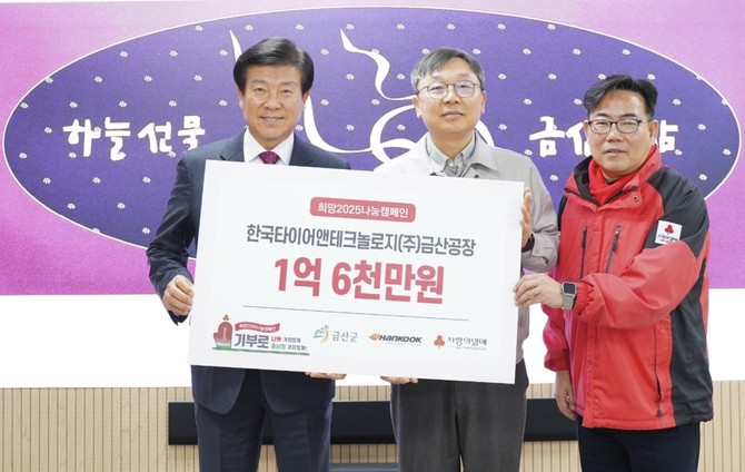 앞선 이날 오전에는 충남 금산군청을 방문해 오상현 한국타이어 금산공장장, 박범인 금산군수, 유병설 충남사회복지공동모금회 사무처장 등이 참석한 가운데 성금 1억6000만원을 충남사회복지공동모금회에 전달했다.