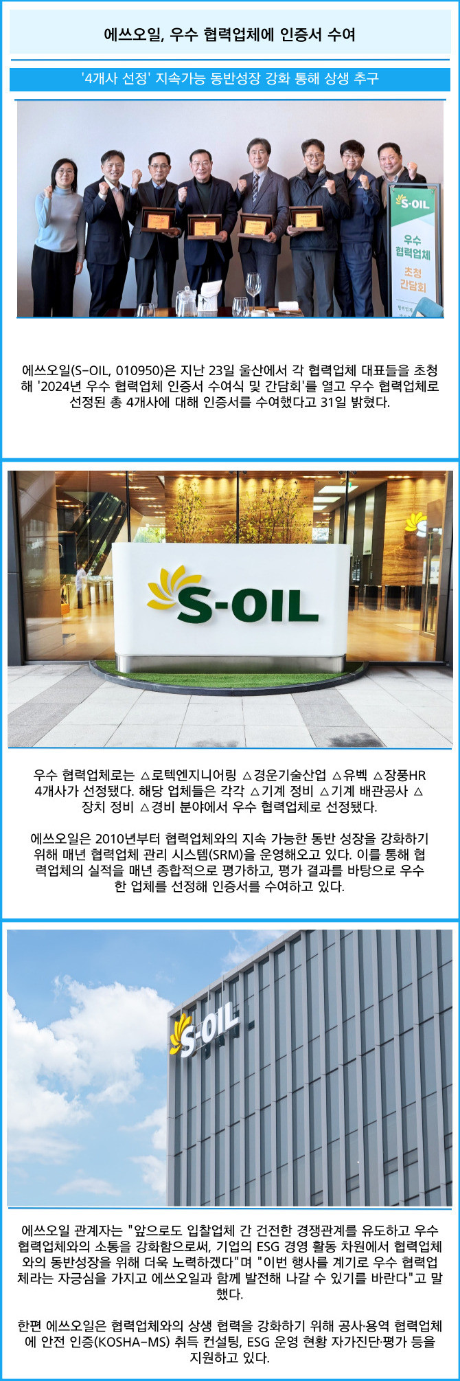 [프라임경제] 에쓰오일(S-OIL, 010950)은 지난 23일 울산에서 각 협력업체 대표들을 초청해 '2024년 우수 협력업체 인증서 수여식 및 간담회'를 열고 우수 협력업체로 선정된 총 4개사에 대해 인증서를 수여했다고 31일 밝혔다.