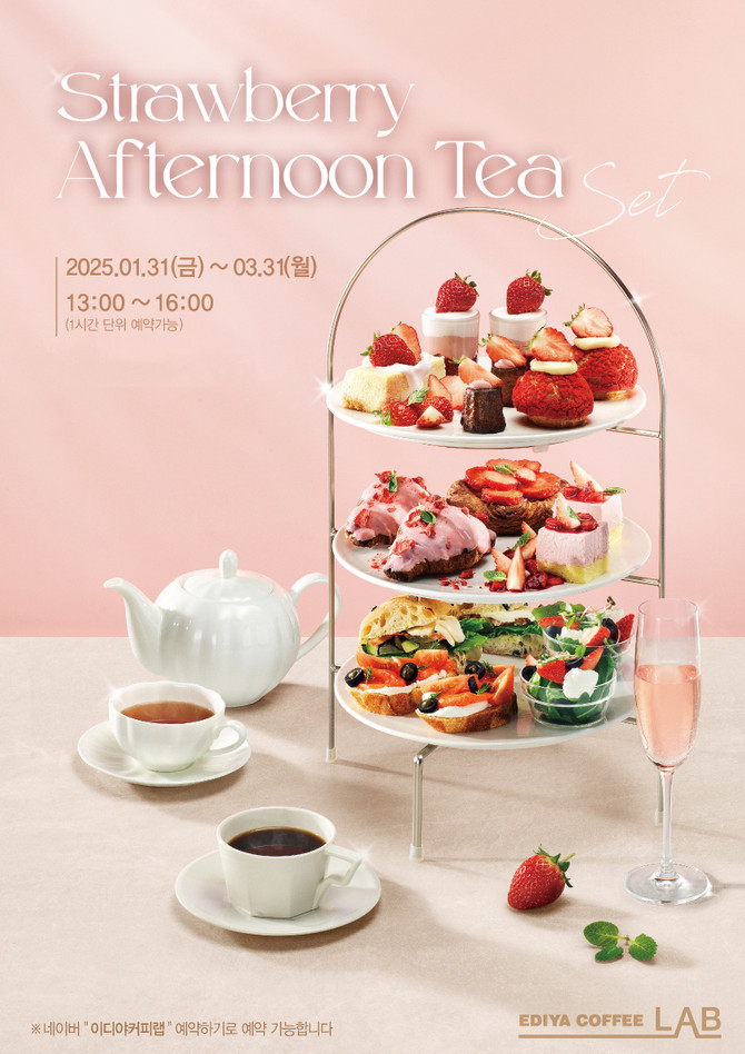 이디야커피랩의 '스트로베리 애프터눈티 세트'는 1월31일부터 3월31일까지, 평일과 주말 오후 1시부터 4시까지 예약할 수 있으며, 이용 시간 제한은 없다. 예약은 이디야커피랩 네이버 예약 플랫폼을 통해 간편하게 진행할 수 있다.