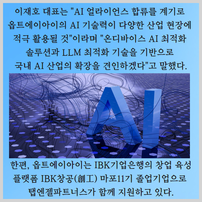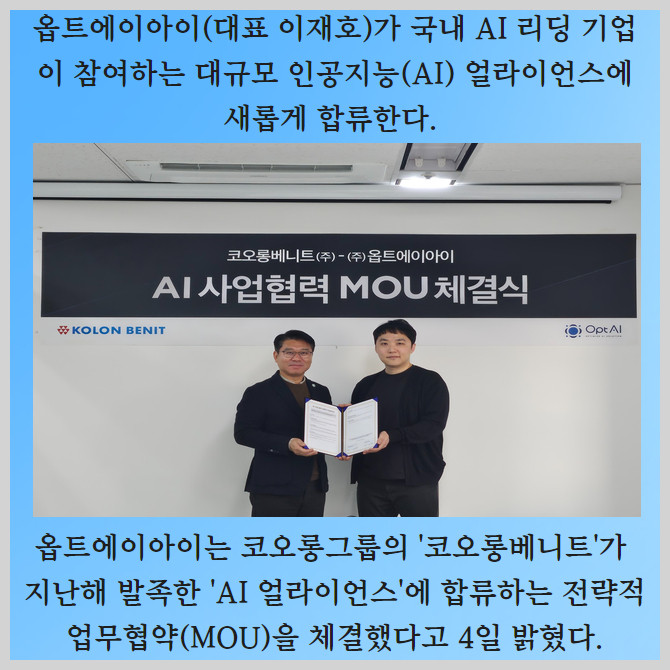 [프라임경제] 온디바이스 AI 최적화 솔루션 기업 옵트에이아이(대표 이재호)가 국내 AI 분야 70여 개의 리딩 기업이 참여하는 대규모 인공지능(AI) 얼라이언스에 새롭게 합류한다. 옵트에이아이는 코오롱그룹의 '코오롱베니트'가 지난해 발족한 'AI 얼라이언스'에 합류하는 전략적 업무협약(MOU)을 체결했다고 4일 밝혔다.
