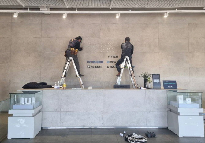 서울 용산구에 위치한 구 쌍방울그룹 본사 사옥 1층 로비 내 CI 제거 모습. © 쌍방울