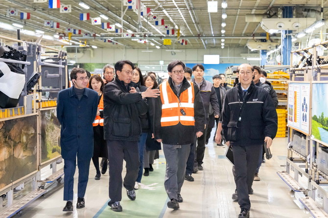 스테판 드블레즈 사장(왼쪽 첫번째), 박형준 시장(왼쪽 세번째), 이해진 제조본부장(왼쪽 네번째)이 부산공장을 점검하고 있다. ⓒ 르노코리아